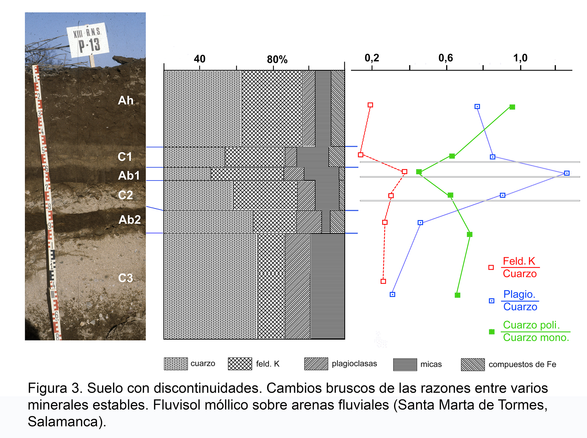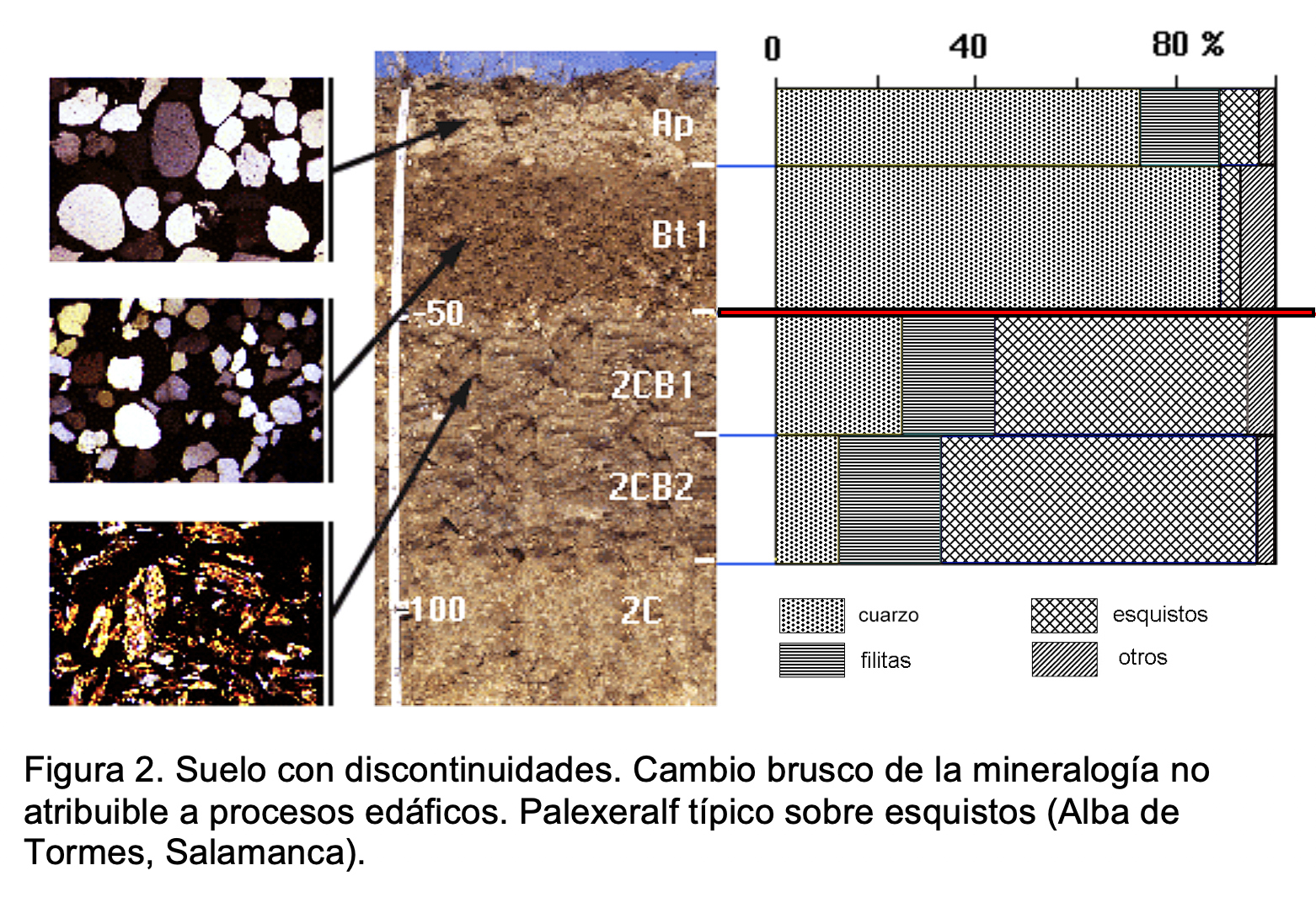 2. Mineralogía diferente de las gravas y/o arenas. Por ejemplo, si muchos de los fragmentos de roca de los horizontes superiores no tienen la misma litología en los horizontes inferiores de un suelo es lógico admitir que existe una discontinuidad; los horizontes superiores no se han formado a partir de la misma roca que los inferiores. Dentro de la misma mineralogía las discontinuidades pueden a parecer por cambios bruscos entre las razones de dos minerales de similar estabilidad (ortoclasa/moscovita) o incluso de diferente grado de alteración (feldespatos/cuarzo). Además de por diferente mineralogía, las discontinuidades se pueden detectar por cambios morfológicos y micromorfológicos: granos de arena redondeados frente a otros angulosos, granos monocristalinos frente a granos policristalinos...