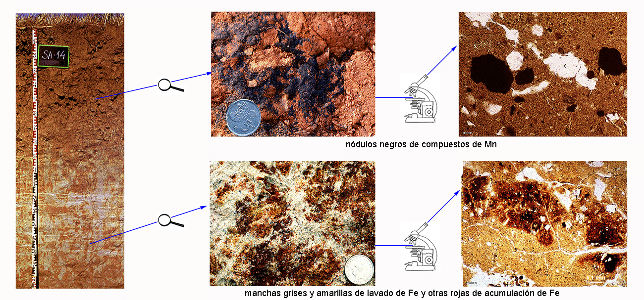 Rasgos de acumulación. Acumulaciones locales de Fe y/o Mn formando nódulos, motas (similares a los nódulos pero son dominios más grandes de bordes generalmente difusos) y películas (cútanes). Los de Fe3+son de colores rojos oscuros mientras que los nódulos de Mn son siempre totalmente negros.