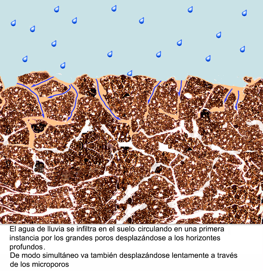 movilizando a la arcilla de los horizontes superiores, la cual al dispersarse pasa a la solución del suelo en forma de suspensión. Por la acción de la gravedad, las suspensiones se infiltran por el suelo a través de los macroporos. Al alcanzar estas suspensiones horizontes profundos en los que el suelo se encuentra seco el agua de las suspensiones que migran por los macroporos es succionada por los microporos de las zonas circundantes;