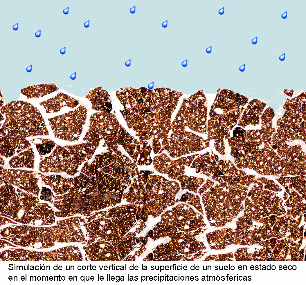 Con las precipitaciones atmosféricas el agua de lluvia impacta sobre la superficie del suelo y se infiltra. No podemos ver su reacción con las partículas en el interior del suelo pero si podemos extrapolar a lo que ocurre en la superficie cuando un exceso de lluvia rebasa la capacidad de infiltración del suelo y se forma una capa de agua sobre la superficie.