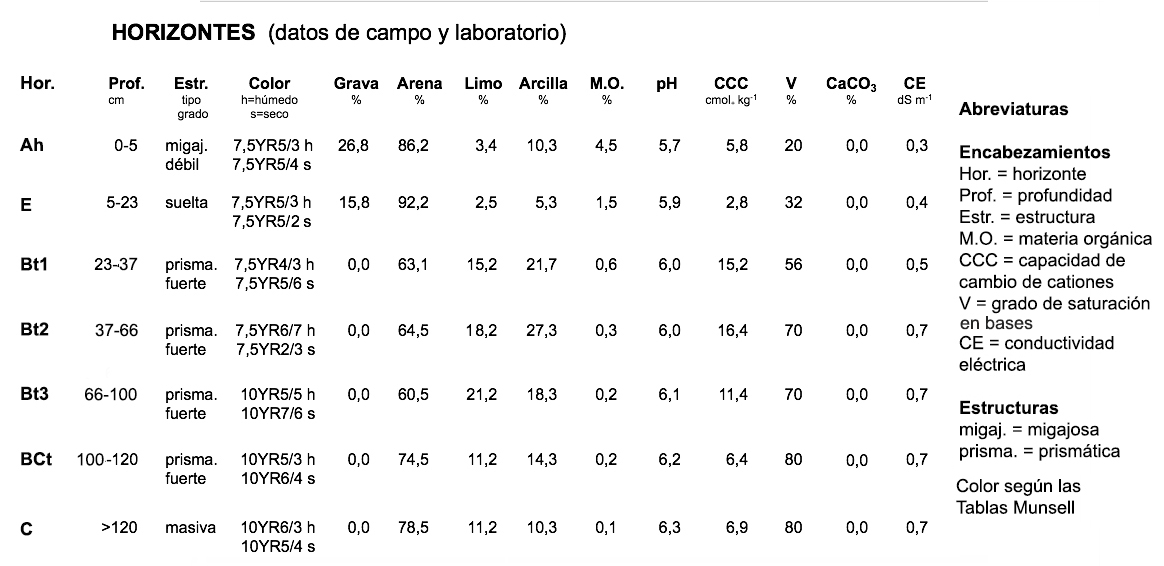 Son suelos de colores claros, muy pobres en materia orgánica, de texturas gruesas (como es lógico por el material original), arenosa franca y franco arenosa par los horizontes A, E y C, y netamente más arcillosa y limo en los horizontes Bt y Bw (franco arcillo limosa y arcillosa). Suelos ácidos con muy baja capacidad de cambio de cationes (a excepción de los Bt y Bw). Moderadamente desaturados en bases. Bajas capacidades de retención de agua y altos valores para la densidad aparente.