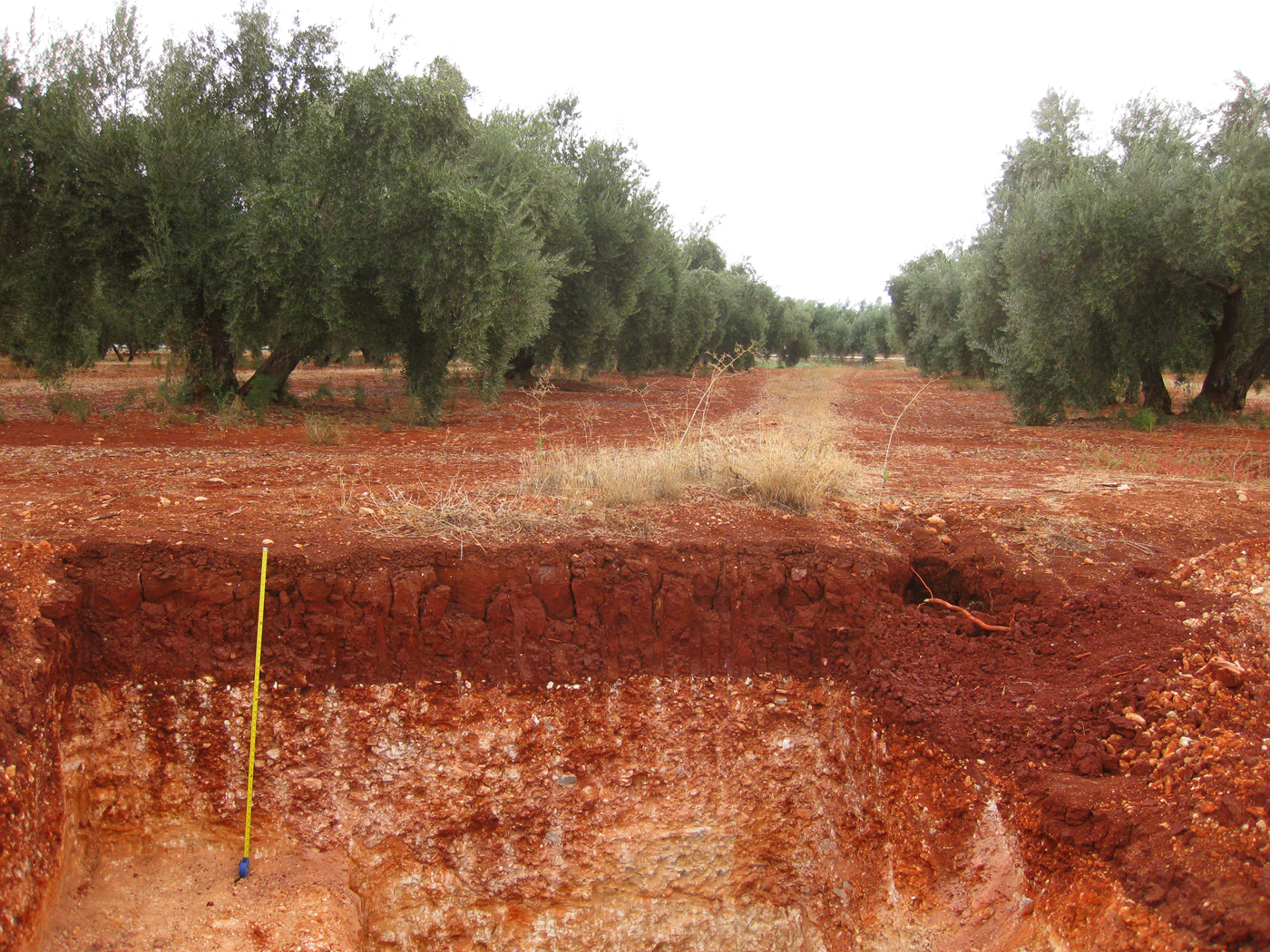Perfil complejo: Luvisol ródico cálcico decapitado Este es el perfil del suelo y su paisaje (olivar). Es muy ilustrativo la zona límite entre el Bt rojo y el Ck blanquecino. ver el borde ampliado