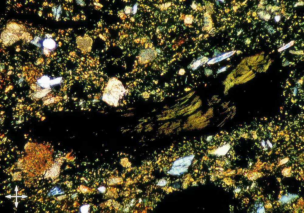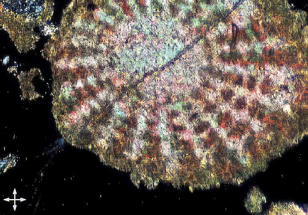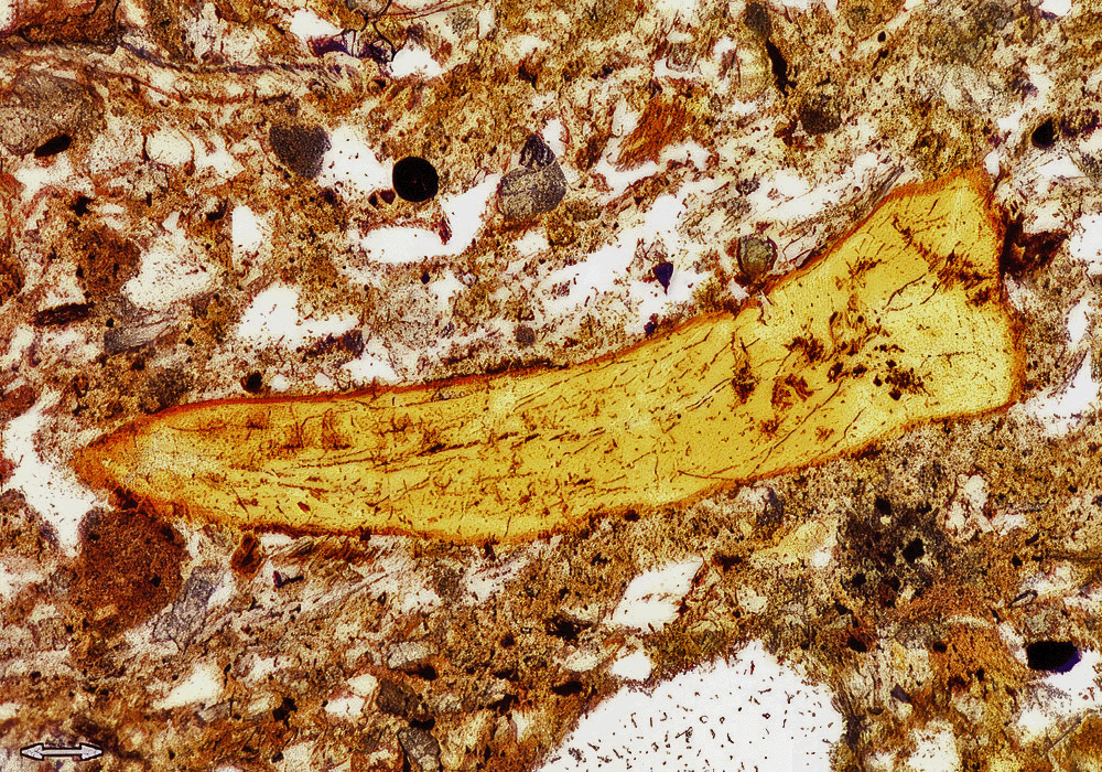Bones. Mainly formed of apatite fibre (very low interference colour).