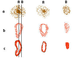 Una sección tangencial (B) de un nódulo nucleico (a) puede no tocar el núcleo y aparecen como un nódulo típico; una sección subtangencial de un canal o cavidad o hipo o cuasi revestimiento (b) puede simular la presencia de nódulos impregnativos (B). Una sección tangencial de un revestimiento de un canal (c) puede aparecer como un relleno(B). Las secciones (A) darían interpretaciones correctas.