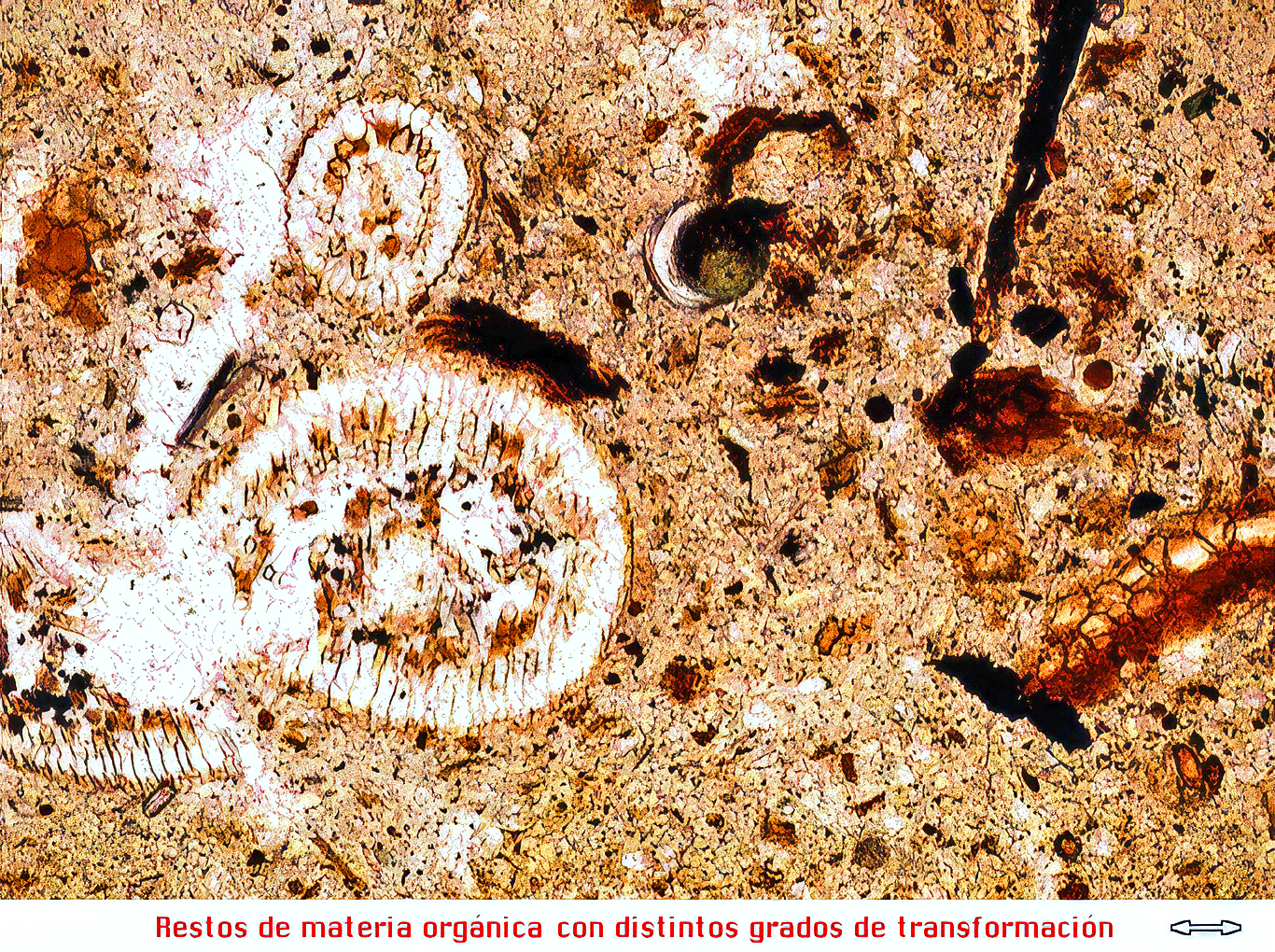Chemical alteration affects both soil minerals and organic matter. The residues of organic matter incorporated in the soil at the beginning are individual fragments that clearly show their tissues (many of them are birefringent),
