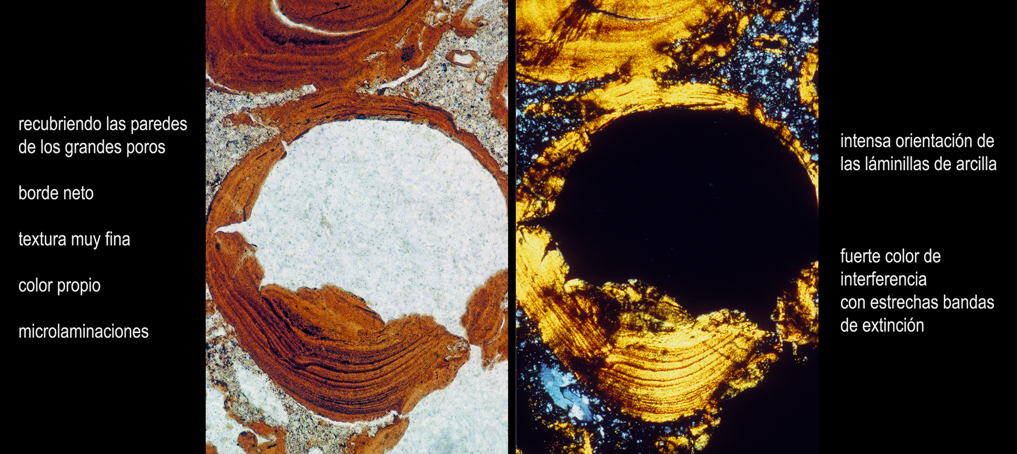 En general, no siempre resulta fácil juzgar si un determinado dominio de arcilla orientada es iluvial o no, pero quizás sea el microscopio la herramienta principal en la identificación de la transformación de arcilla. En esta figura mostramos una serie de campos microscópicos en los el reconocimiento del origen iluvial de la arcilla va siendo cada vez más problemático.