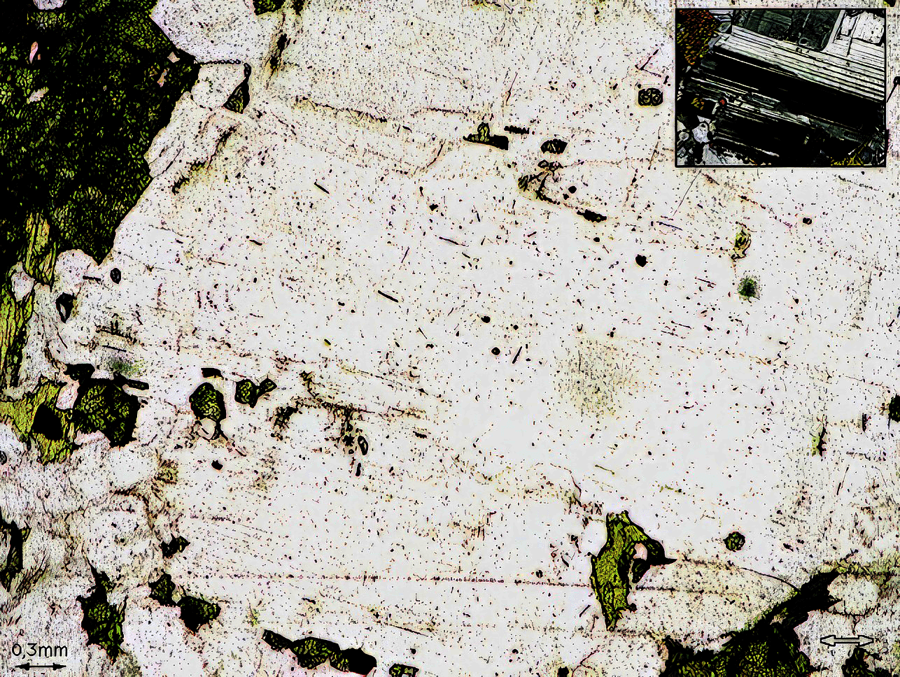 Ortosa: similar al cuarzo pero de aspecto sucio (o grisáceo), a veces con maclas de dos individuos.