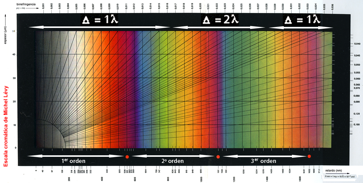 La inmensa mayoría de los cristales producen la doble refracción de la luz, es decir la luz al atravesar el cristal se descompone en dos ondas que vibran en planos perpendiculares y con una misma dirección de propagación; a su vez las direcciones de vibración y propagación son perpendiculares; además en cada dirección presentan diferente velocidad de vibración por lo que hay un componente lento que se retrasará en su propagación con respecto a la onda que vibra en la dirección rápida. El color de interferencia se forma como resultado de la interferencia de las dos ondas que vibran desfasadas en el cristal al vibrar en el único plano de dirección permitida en el analizador. Al ir aumenta el retardo entre las ondas van apareciendo los diferentes colores de interferencia en la siguiente secuencia, gris, amarillo, naranja, rojo, violeta, azul y verde. Si el retardo se hace todavían más grande del que le corresponde al verde aparece el amarillo y se repite la secuencia. Para diferenciar estas secuencias repetitivas los colores se clasifican en órdenes como muestra la escala cromática de Michel-Levy.