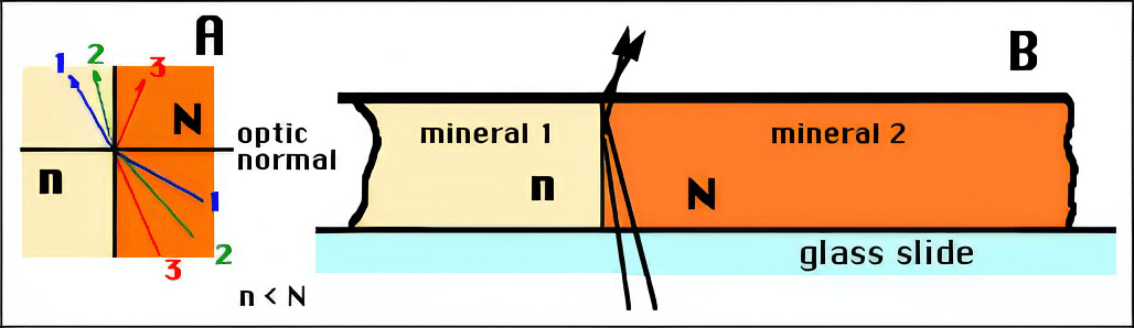 The same happens in diagram B, which represents the vertical cut of a preparation with contact between two minerals. The rays represented are reflected and cause an accumulation of light along the side of the line of contact of the mineral with the higher index (they would be on the other side in medium "n" if they had been refracted). These reflected beams produce the Becke Line.