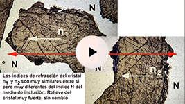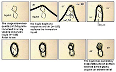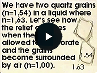 The following video shows two quartz grains (n=1.54) submerged in a highly volatile liquid (n=1.63). When the liquid evaporates, the grains become surrounded by air (n=1.00) and their relief changes intensely.