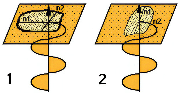 En la siguiente se figura se representa un cristal en el microscopio. En la posición (1) las ondas de luz procedentes del polarizador llegan vibrando coincidentes con una de las dos direcciones de vibración del cristal. Para esta dirección el índice de refracción vale "n1". Si a partir de esta posición giramos el cristal 90 grados (caso 2) las ondas se propagan ahora en el cristal en la otra dirección perpendicular y de valor de índice de "n2". Si el cristal es muy anisótropo, "n1" será muy diferente de "n2" y el relieve será muy diferente en cada caso (el bálsamo que rodea al cristal es isótropo y por tanto es siempre el mismo "n" (relieve en la posición 1 = n1 - n y en la posición 2 = n2-n). ¡ El relieve de un mismo grano mineral cambia al girarlo en la platina del microscopio!