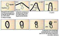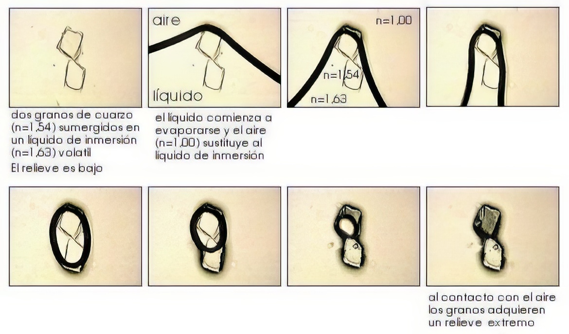 En el siguiente video se muestran dos granos de cuarzo (n=1,54) sumergidos en un líquido muy volátil (n=1,63). Al evaporarse el líquido los granos pasan a rodearse de aire (n=1,00) y su relieve cambia intensamente