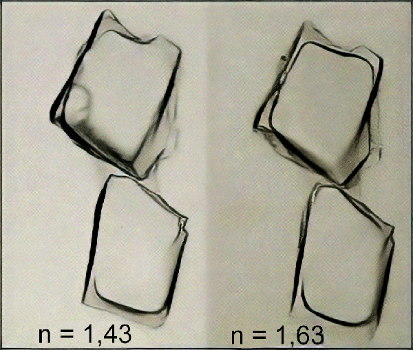 En la figura se muestra unos granos de cuarzo (n=1,54) sumergidos en dos líquidos de índices muy diferentes (n1=1,43 y n2=1,63). El relieve que muestran los granos de cuarzo es similar en ambos casos porque la diferencia de su índice y el de los aceites es tambien similar (1,54 - 1,43 = 0,11 y 1,63 - 1,54 = 0,09).