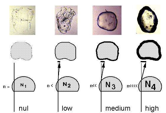 Relief is a consequence of the difference between the refractive indices of the two mediums in contact. When there is only slight relief, the difference is small, whilst when the relief is sharp, there exists a significant difference between the indices of the mineral and the medium.