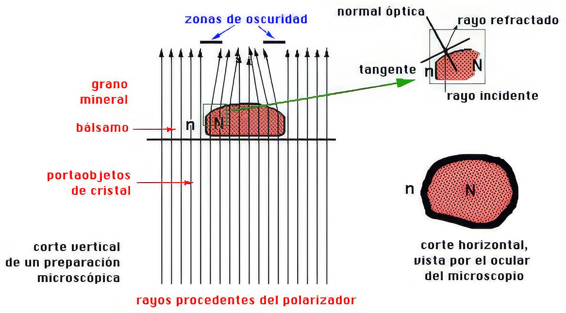 En la figura se representa un dibujo de un grano mineral sobre el que inciden los rayos de luz procedentes del polarizador. Se ha supuesto que el mineral tiene un índice de refracción "N" mayor que el del bálsamo ( o cemento) "n" que le rodea . A la salida del cristal, los rayos se desvian separándose de la normal óptica (al pasar de un medio de índice mayor a otro menor). Los rayos se concentran en unas zonas y abandonan otras, originándose una zona de sombra. Esto ocurre en todo el borde del grano, quedando este resaltado. Cuanto mayor sea la diferencia entre los índices de refracción del mineral y el del medio que lo rodea mayor será la refracción y por tanto más ancha será la banda oscura, más resaltará el grano y por tanto más alto será su relieve.