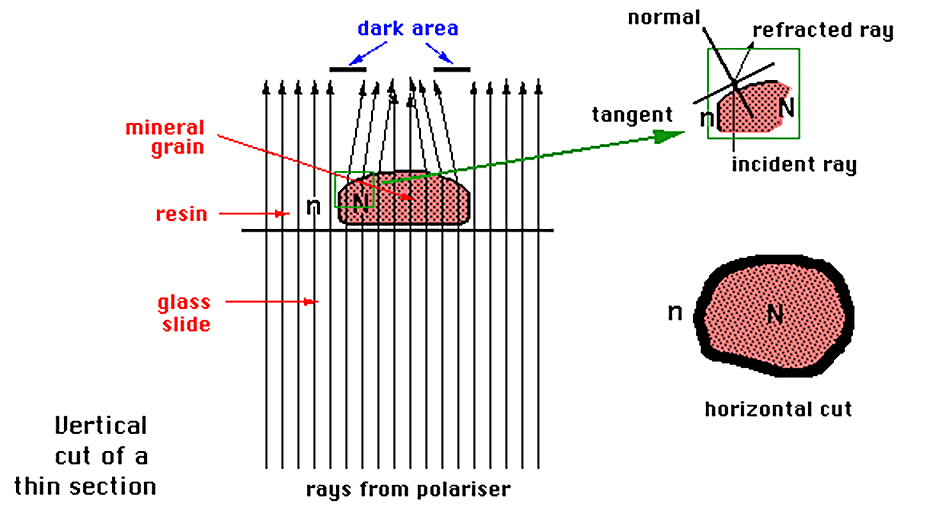 In this case N>n, and the rays bend away from their optic normal (which is perpendicular to the surface which separates the two mediums) and are concentrated in the mineral, leaving a space which causes a dark area to appear on its edge.