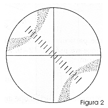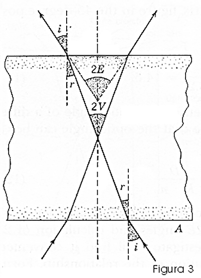 This is not actually exactly 2V (it is an approximate value) and is known as the apparent optic angle (2E) (figure 3). To calculate the true value of 2V, the refractive indices of the mineral must be considered in order to correct the calculated value 2E in the interference figure..