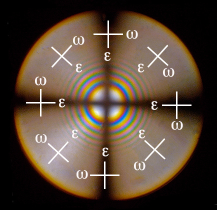 En la figura de interferencia es posible reconocer si en un punto cualquiera las ondas vibran en direcciones de coincidencia o no, con las del polarizador y analizador. Es decir, si se encuentra en posición de extinción o, por el contrario, mostrará un determinado color de interferencia. Para ello basta unir el punto en cuestión con el centro de la cruz, coincidiendo con esa dirección vibrará una onda y en la perpendicular lo hará la otra. El componente extraordinario (épsilon) vibrará en la dirección radial mientras que el ordinario (omega) lo hará en dirección tangencial al ciculo que pase por ese punto. Cuando estas direcciones de vibración coincidan con las direcciones este-oeste, para una onda, y norte-sur, para la otra, este punto se encontrará en oscuridad. Si son otras cualesquiera el punto mostrará color de interferencia.