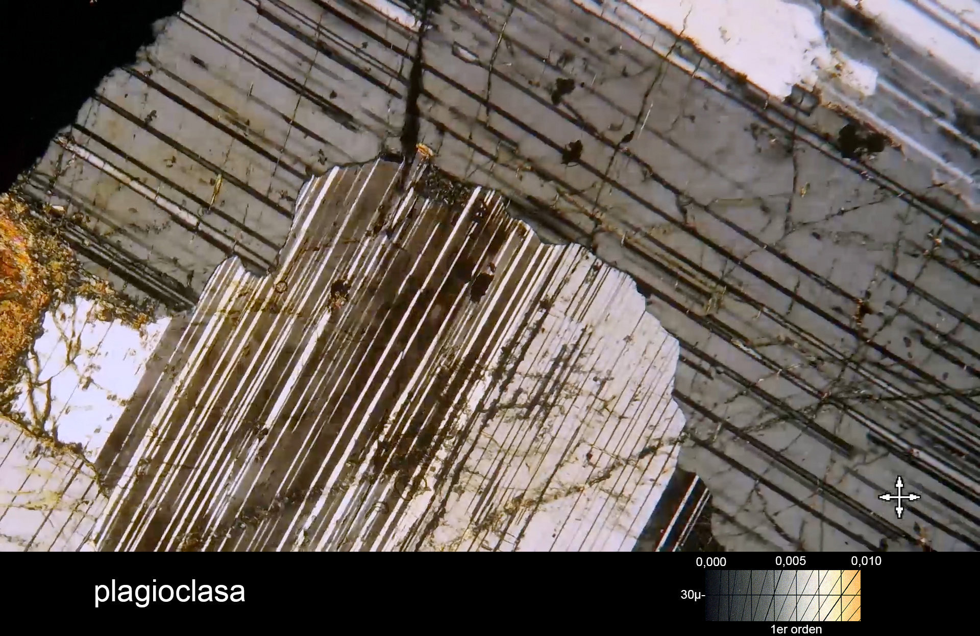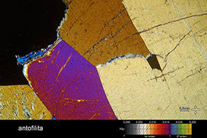 The colour bands located to the right and below the images represent the different colours that the different crystals of each mineral can present depending on how they have been oriented in the thin layer.