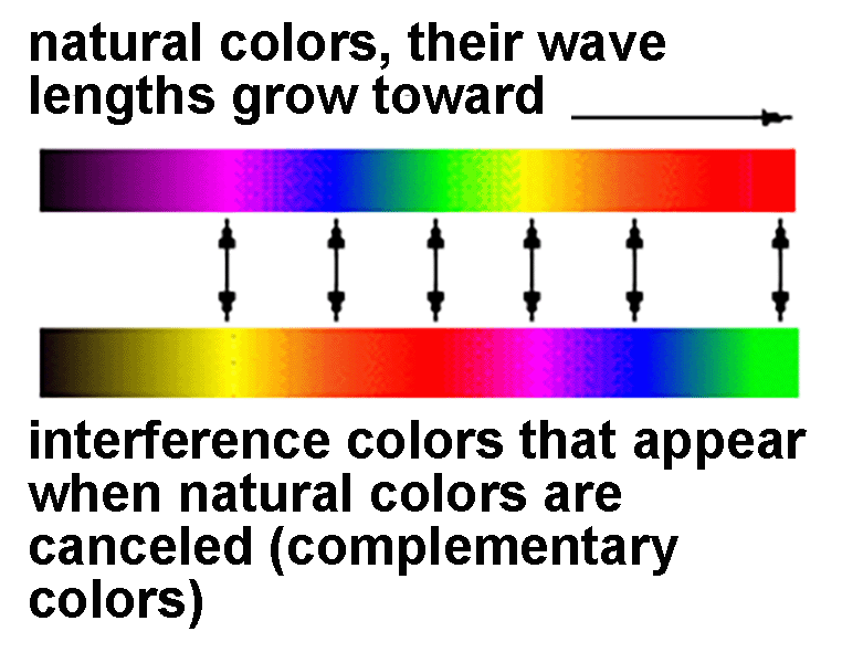 When retardation is nil, all the colours will be annulled and the crystal will appear to be black. As retardation increases, a moment will come in which it reaches the value corresponding to the colour with the smallest wavelength: violet; the violet will be annulled and its complementary colour will appear as the interference colour: yellow. Subsequently, the retardation will reach the value of the colour with the next lowest l, which is blue; the blue will be annulled and its complementary colour, orange, will appear. This will happen successively as the wavelengths of green, yellow, orange and red are reached, and their complementary colours of interference will appear: red, violet, blue and green, respectively.