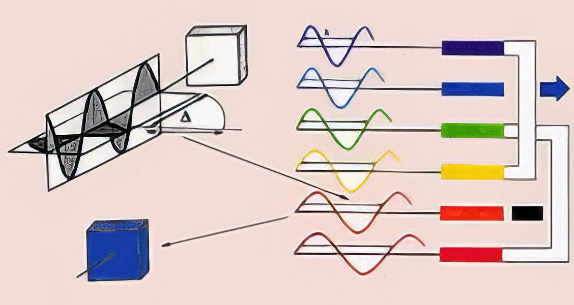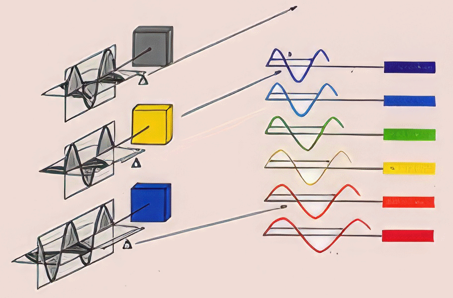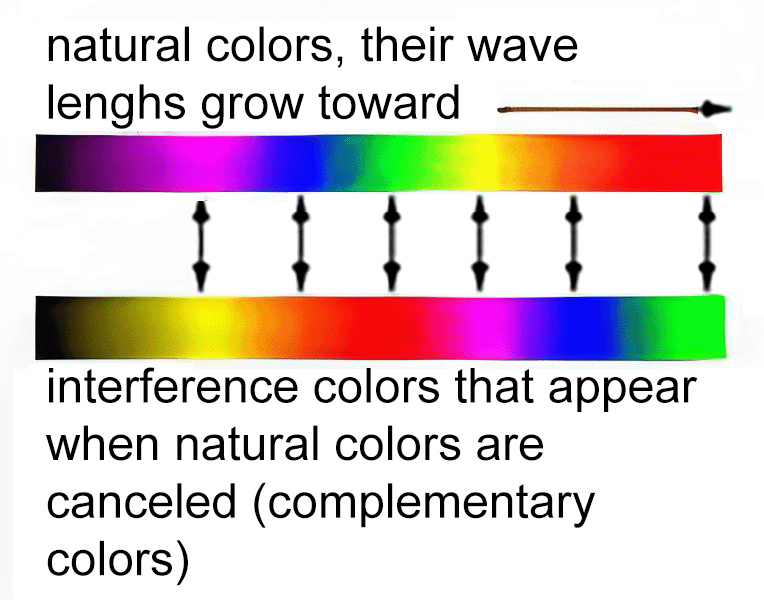 The next figure shows how as the retardation between the two waves increases, the wave-lengths of the lowest colours are reached and these colours are nullified, causing their complementary colours to appear. As the retardation increases, a grey colour will appear and a moment will come in which it reaches a value corresponding to the smallest wave-length, whose colour is violet.
