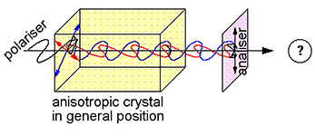 When a polarised light wave arrives at an anisotropic crystal in a general position (neither in the specific isotropic position nor coinciding with the directions of vibration of the nicols, already considered in previous screens), it experiences double refraction. The initial incident wave splits into two polarised waves which vibrate in perpendicular planes and which, for simplicity's sake, we will imagine to be moving with the same direction of propagation, as indicated in the figure 1 and the video.