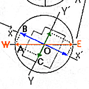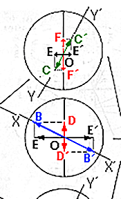 La onda del polarizador (horizontal en el dibujo) está representada por el vector OA. Esta onda, al llegar al cristal, se descompondrá en dos ondas que vibran en planos perpendiculares XX' e YY', representadas por los vectores OB y OC.