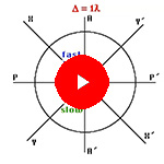 La onda procedente del polarizador (horizontal en el diagrama) está representada por el vector OA (OW en el video). Esta onda, al llegar al cristal, se divide en dos (en las dos únicas direcciones permitidas: XX´ and YY´), representada por los vectores OB y OC.