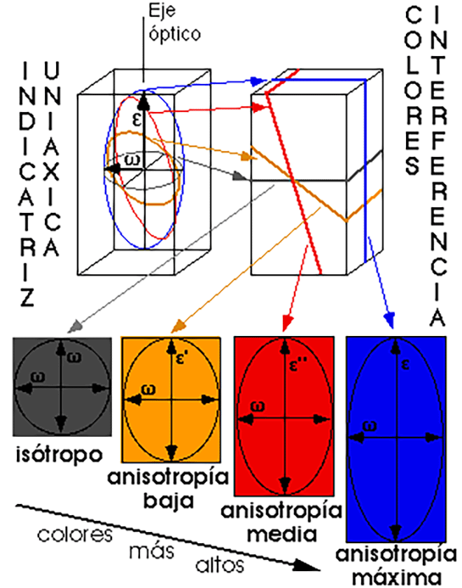 Los colores de interferencia de cada talla de un mineral podemos deducirlos a partir de su indicatriz óptica. En la figura mostramos como para un cristal uniáxico puede ir cambiando el color de interferencia según se va inclinando el plano de corte. El color de interferencia varía desde ser nulo para la talla horizontal (perpendicular al eje óptico) hasta su máximo valor representado por la talla vertical (paralela al eje óptico), pasando por un serie de colores intermedios correspondientes a las tallas inclinadas (a mayor inclinación color más fuerte).