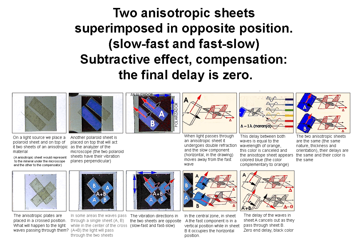 When the fast and slow components of the compensator are opposite to those of the mineral (fast with slow and slow with fast) this leads to subtractive effects. The advantage that the fast wave gains over the slow one during its path through the mineral is lost when passing through the compensator, on finding that the slow component of the the compensator vibrates in this direction. The final retardation is reduced and consequently the resulting interference colour goes down in value.