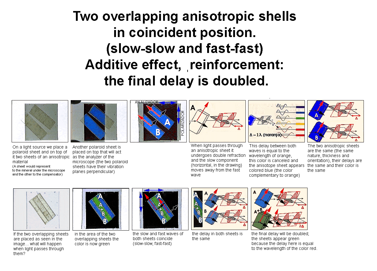 When the fast and slow components of the compensator coincide with those of the mineral (fast with fast and slow with slow), this will lead to additive effects. The advantage which the fast wave gains over the slow one during its path through the mineral will increase when passing through the compensator. The final retardation will therefore increase and, as a result, the interference colour will be higher.