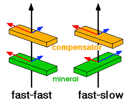As the light passes through the compensator, this introduces retardations which are superimposed on the retardation introduced by the mineral. The results will be very different according to whether the fast and slow components of the mineral coincide with those of the compensator (fast with fast and slow with slow) or not (fast-slow and slow-fast), figure 2.