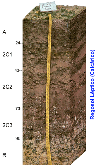 Sin horizontes diagnósticos, con material blando en el hor. subyacente, sin características flúvicas, y sin textura arenosa, ha de ser un Regosol. Dentro de los Calificadores Principales por presentar una roca dura antes de los 100 cm será Léptico y por sus carbonatos primarios (no se describen signos que hablen de carbonatos secundarios) es calcárico. De los Suplementarios es Loámico por la textura franco arcillo arenosa del horizonte dominante de 43-73 cm y Ocrico por su bajo contenido en carbono orgánico a los 50 cm).