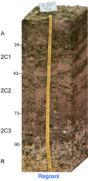 Sin horizontes diagnósticos, con material blando en el hor. subyacente, sin características flúvicas, y sin textura arenosa, ha de ser un Regosol.