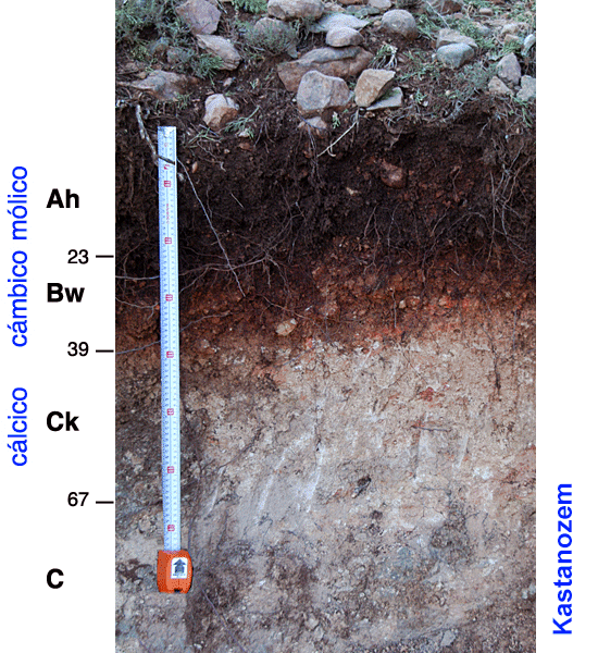 Con un mólico espeso tenemos que ir al grupo de los "...zems" y dentro de estos al tener también cálcico o es un Chernozem o un Kastanozem. Al no ser muy oscuro el mólico debemos de desechar a los Chernozems.