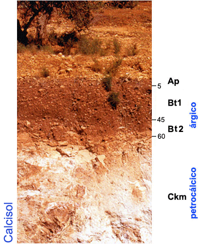 Al presentar un cálcico dentro de los 100 cm superficiales y un árgico impregnado en carbonatos hemos de clasificar al suelo como un Calcisol.