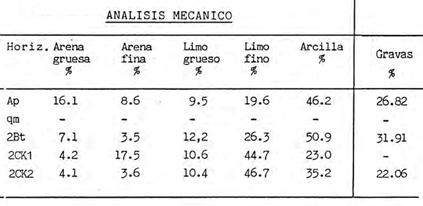 Del análisis textural destaca la intensa acumulación de arcilla en los horizontes superiores, especialmente en el 2Bt. Los limos predominan sobre las arenas. Las gravas son abundantes en casi todos los horizontes del perfil; la ausencia de gravas en el horizonte 2Ck1 marca una discontinuidad con respecto a los horizontes que lo limitan.