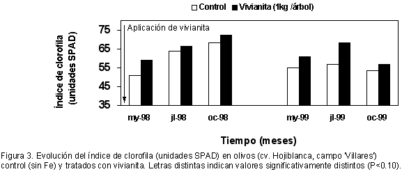 La evolución del índice de clorofila (IC) de los cuatro campos experimentales se muestra en las Figuras 1-4. En los campos experimentales de 'Cañaveralejo' y 'Sequera', se midió el IC antes de aplicar la vivianita (marzo de 1998) y no se observaron diferencias significativas entre los árboles control y los que iban a ser tratados con vivianita (Figuras 2 y 4). En los muestreos realizados el año que se aplicó la vivianita, el IC era mayor en los árboles tratados que en los del control (Figuras 1-4). Las diferencias fueron significativas en octubre en el campo 'Las Pitas' (Figura 1), en mayo en el campo 'Cañaveralejo' (Figura 2), en mayo, julio y octubre en el campo 'Villares' (Figura 3) y en julio y octubre en el campo 'Sequera' (Figura 4). En los muestreos realizados el segundo año después de aplicar vivianita (1998 para el campo 'Las Pitas' y 1999 para 'Cañaveralejo', 'Villares' y 'Sequera'), las diferencias en IC entre los árboles tratados y los del control eran significativas en todos los campos experimentales (Figuras 1-4). El IC, medido en el campo 'Las Pitas' tres años después de aplicar vivianita (1999), fue mayor en los árboles tratados que en los del control. Las diferencias fueron significativas en mayo y octubre (Figura 1). Es decir, la vivianita es eficaz en la corrección de la clorosis Fe en olivo y su efecto parece persistir, al menos, tres campañas agrícolas. Estos resultados están en línea con los obtenidos en peral en cuyo caso el efecto de la vivianita ha persistido durante cinco años (Iglesias et al., 1998). La producción de aceitunas medida en 1998 y 1999 en los campos 'Las Pitas' cv. Hojiblanca y 'Sequera' cv. Manzanilla fue mayor en los árboles tratados que en los del control y las diferencias fueron significativas en 1999 en la finca de 'Sequera' (Tabla 2). El índice visual del color de aceituna medido cv. Manzanilla ('Sequera') fue significativamente mayor en los árboles tratados que en los del control (Tabla 3). Finalmente, el diámetro del tronco (medido en los olivos de dos años) era mayor y de forma significativa en los árboles tratados que en los del control.