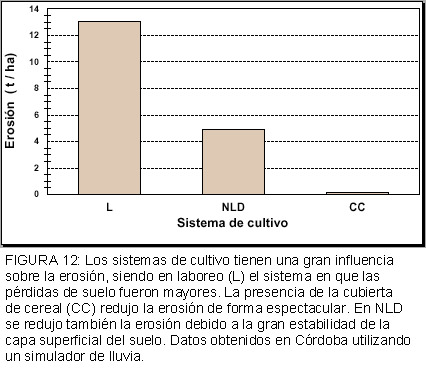 En la Figura 12 presentamos datos de pérdida de suelo en un ensayo de campo realizado en la provincia de Córdoba empleando un simulador de lluvia sobre parcelas en pendiente sometidas a diversos sistemas de cultivo. En dicha figura podemos observar como después de una lluvia de gran intensidad en el suelo con cubierta vegetal se ha reducido prácticamente a cero la erosión, mientras que en el terreno recientemente labrado las pérdidas de suelo fueron muy grandes. En NLD la erosión fue mucho menor que en laboreo, ya que aunque la velocidad de infiltración es menor, la resistencia del suelo a la desagregacion por el impacto de las gotas de lluvia es mucho mayor que en laboreo (Castro, 1993).
