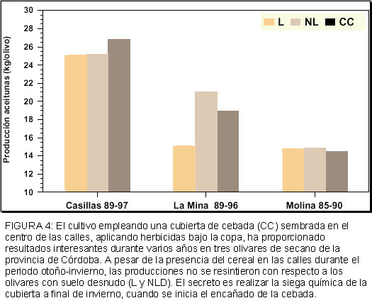 El empleo en invierno de cubiertas de malas hierbas segadas químicamente con herbicidas (NLCI) proporcionó muy buenos resultados a largo plazo desde el punto de vista de la producción del olivar (Pastor, 1991), consiguiéndose un aumento de cosecha del 21 % con respecto al laboreo para el conjunto de los 10 ensayos realizados. Sin embargo, la producción en NLCI fue ligeramente inferior a la del NLD.