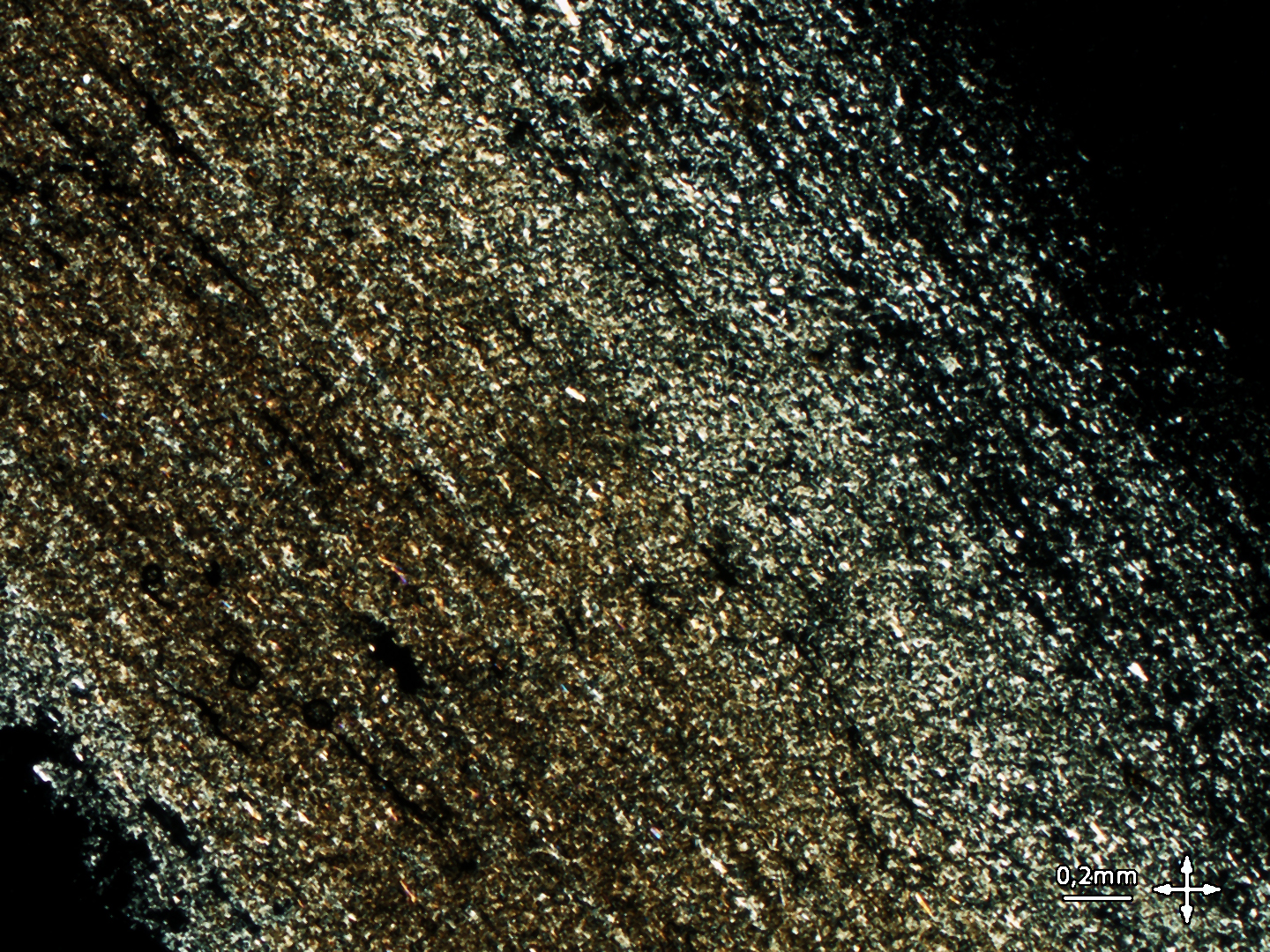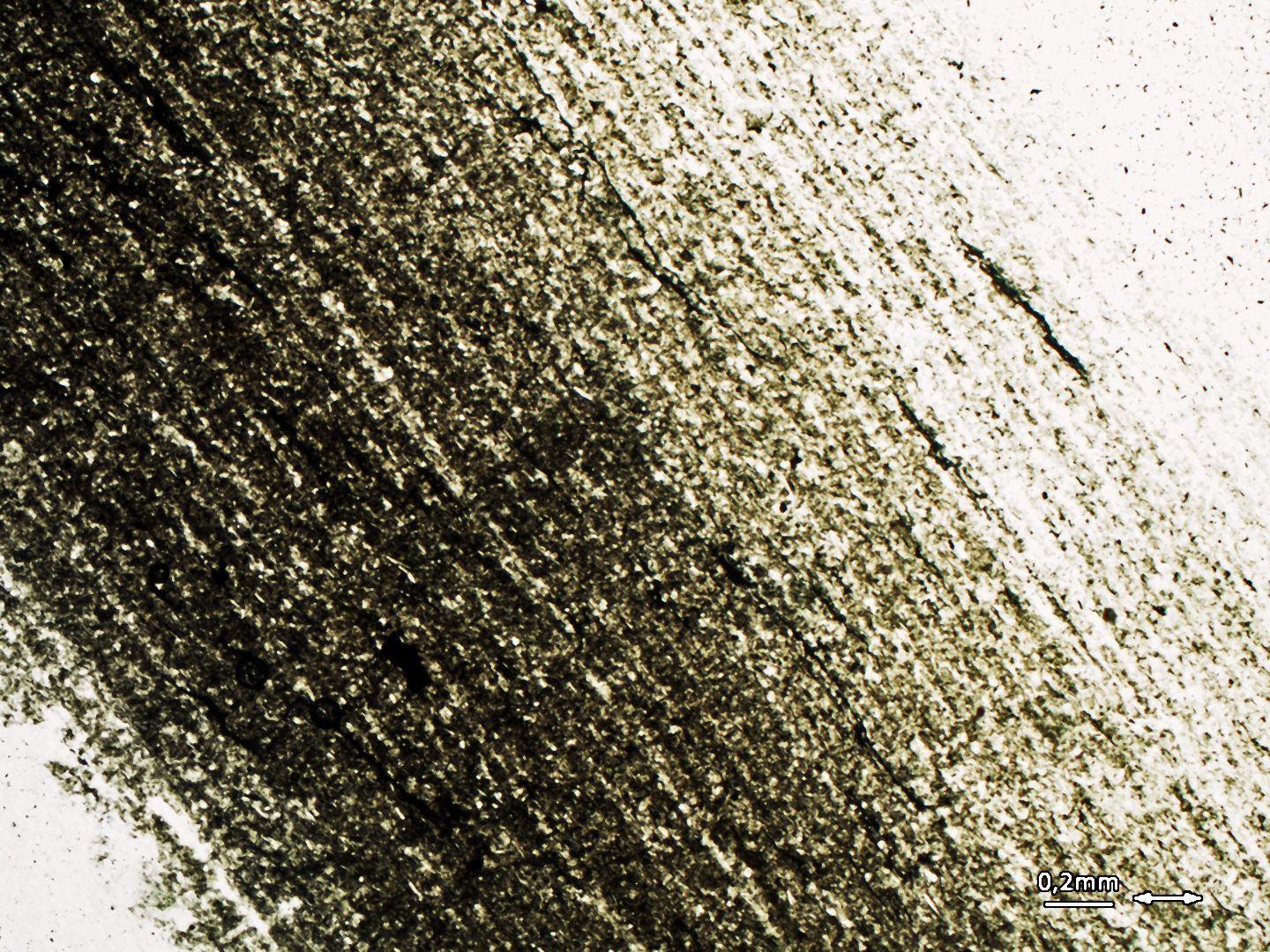 Arcillita bituminosa: cuarzo, feldespatos, sericita, calcita, pirita, magnetita y materia orgánica