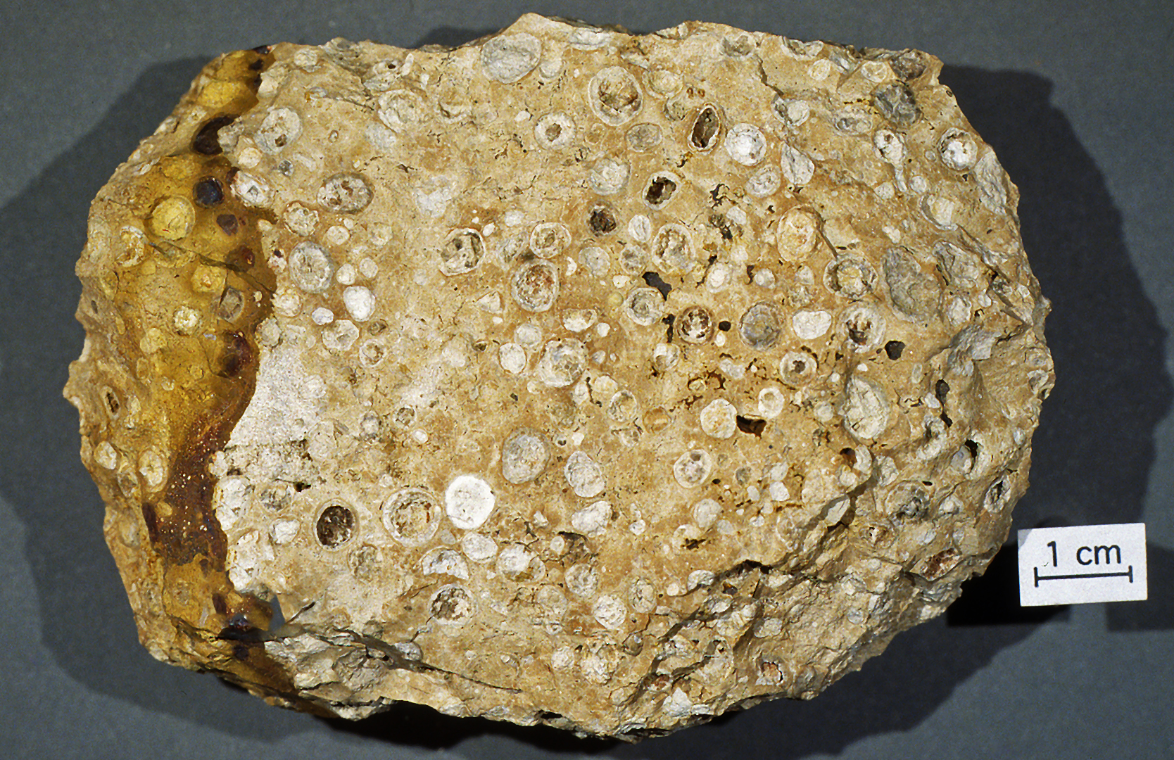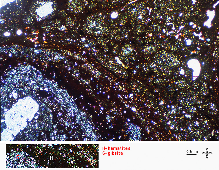 Bauxita. Oolitos (pisolitos) de gibsita, hematites y carbonatos.