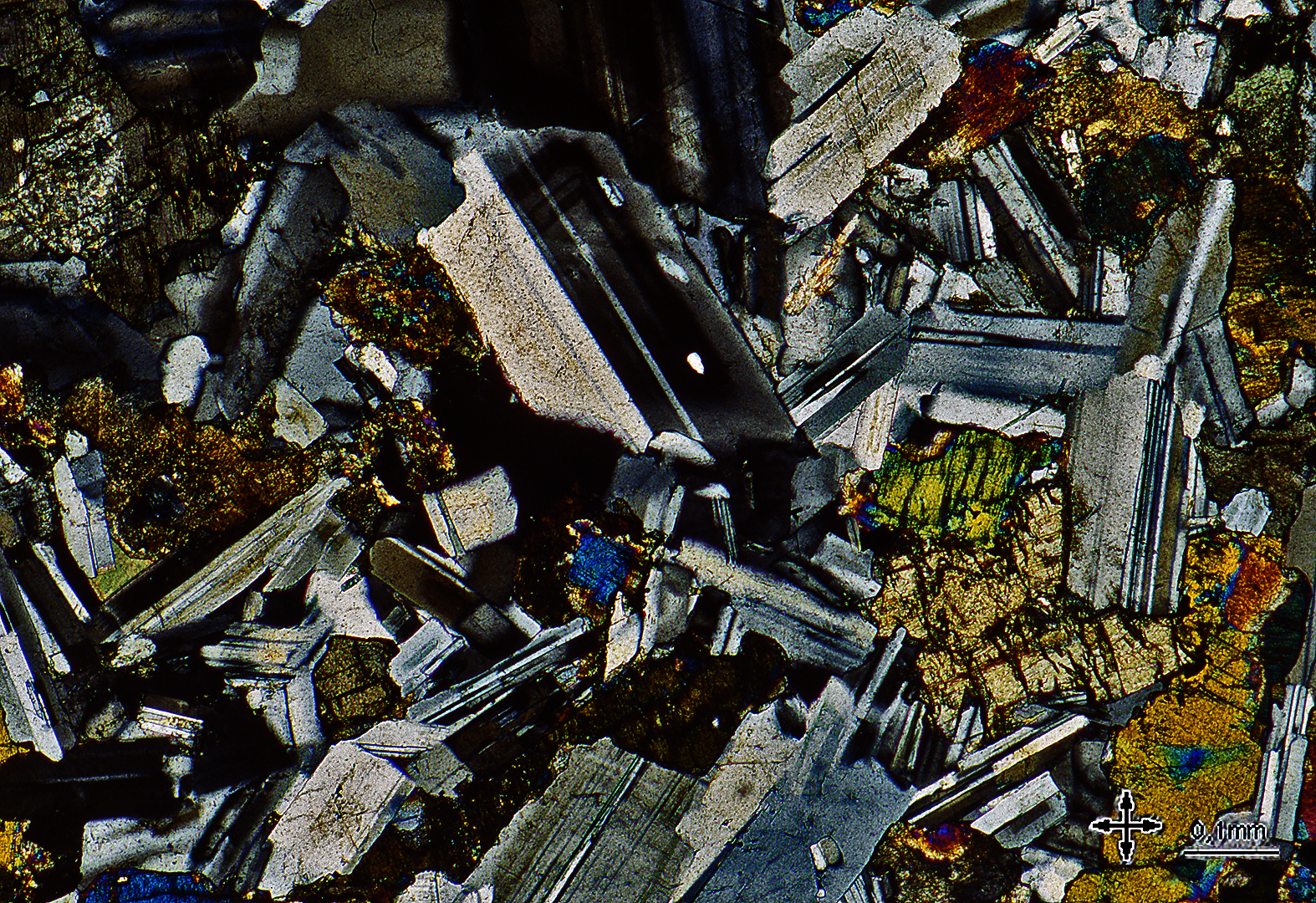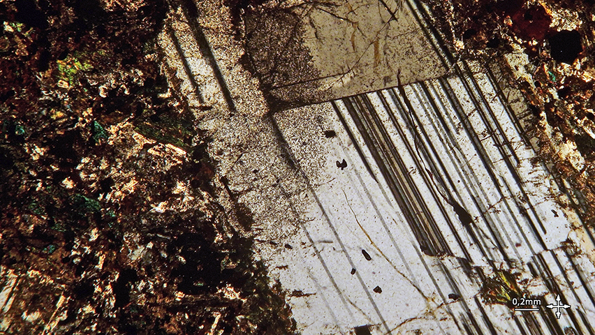 Diabasa porfirica. Esenciales: plagioclasa cálcica y piroxeno (augita y pigeonita). Accesorios: hornblenda, biotita, magnetita, cuarzo, ortoclasa y apatito.