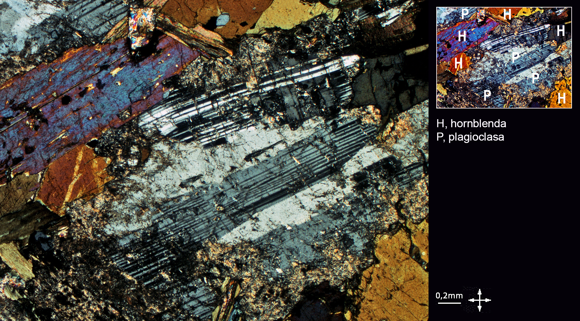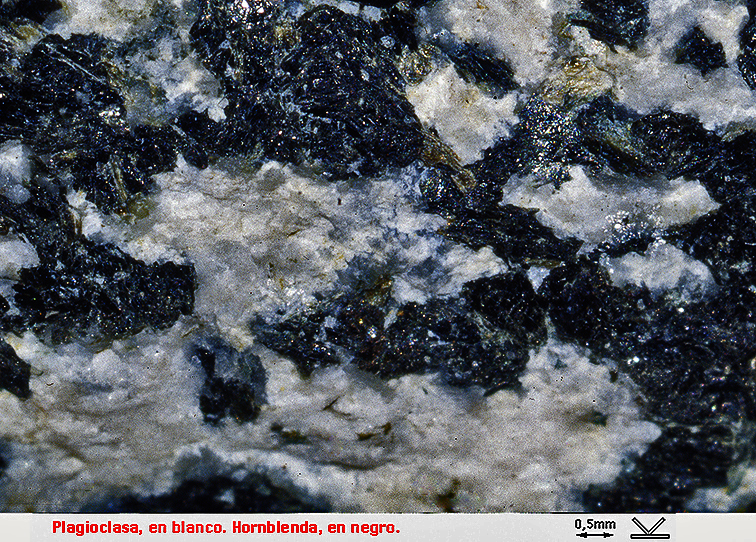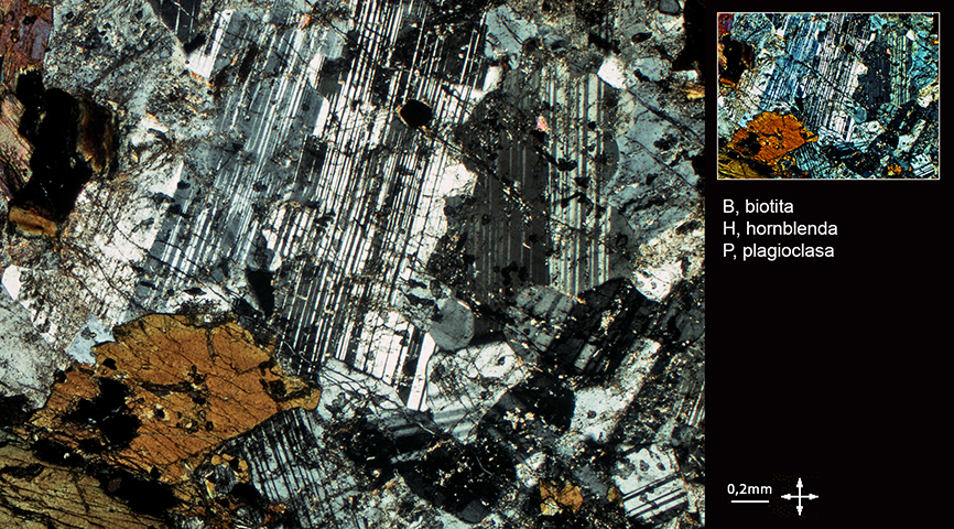 Diorita. Esenciales: plagioclasa (oligiclasa) y hornblenda. Accesorios: esfena, epidota, allanita y magnetita.