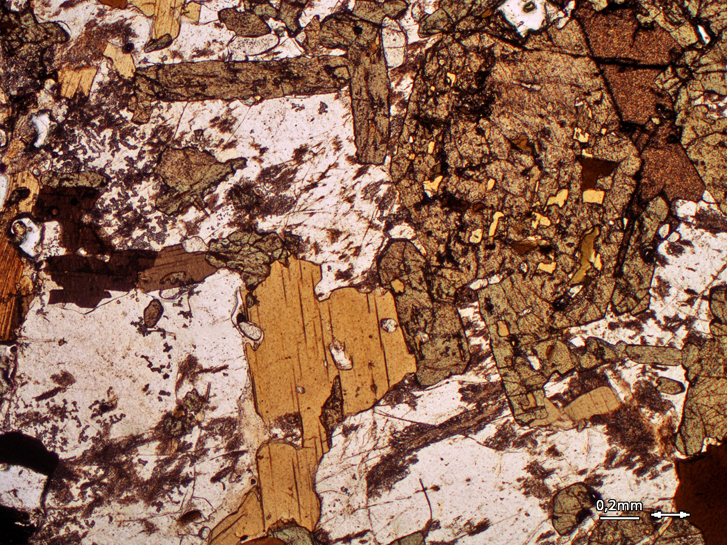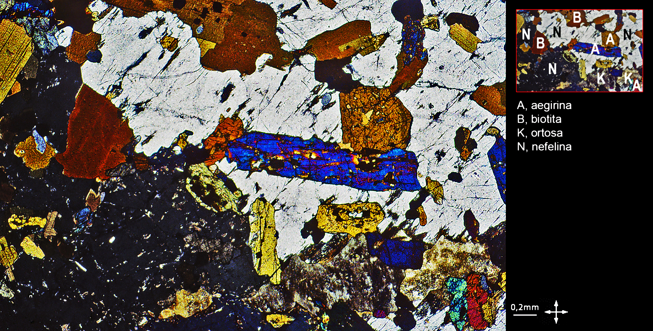 Ijolita. Esenciales: aegirina, biotita y nefelina. Accesorios: ortoclasa y esfena.
