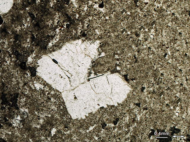 <Riolita. Esenciales: cuarzo, sanidina y plagioclasa. Accesorios: biotita y magnetita.