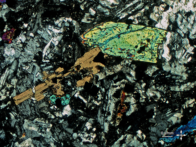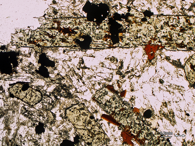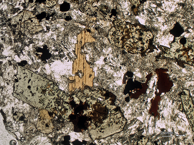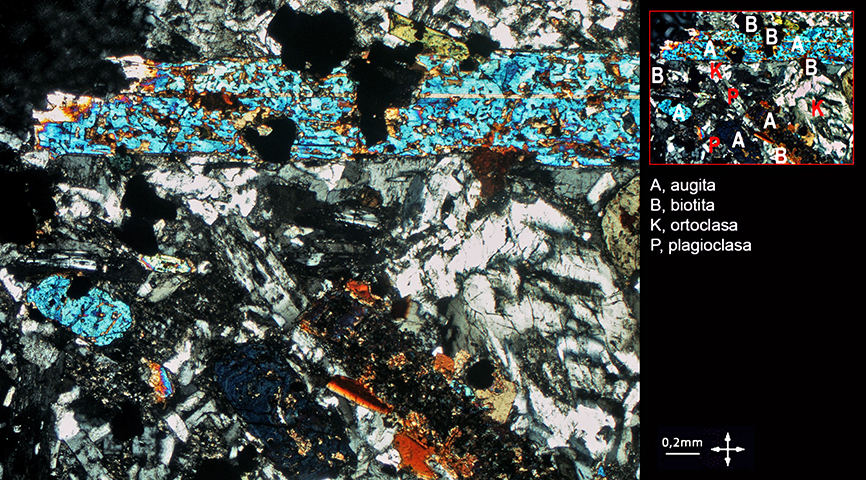 Sienita alcalina. Esenciales: ortoclasa, plagioclasa (albita), nefelina y aegirina. Accesorios: sodalita, magnetita, esfena y apatito.
