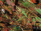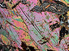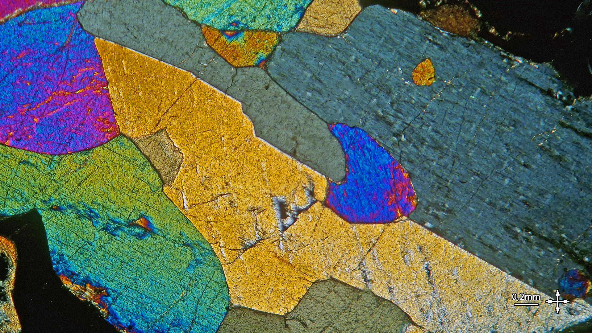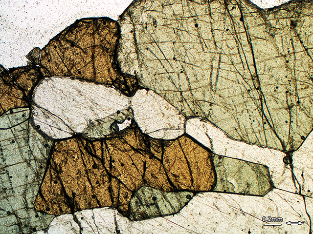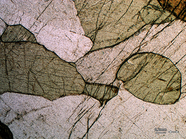 Skarn con cordierita y antofilita. Esenciales: cordierita y antofilita: Accesorios: micas, clorita, apatito, rutilo y magnetita.