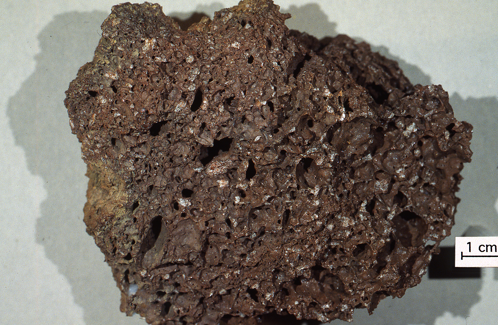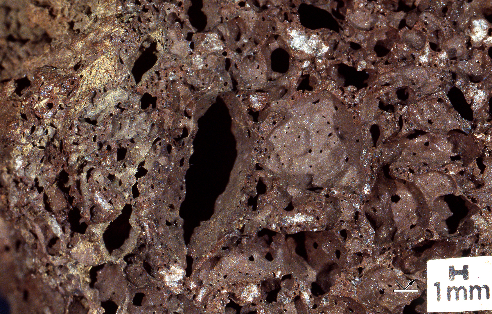 Toba. Alto contenido en poros vesiculares. Fenocristales de plagioclasa cálcica. Matriz: plagioclasa y vidrio opaco.